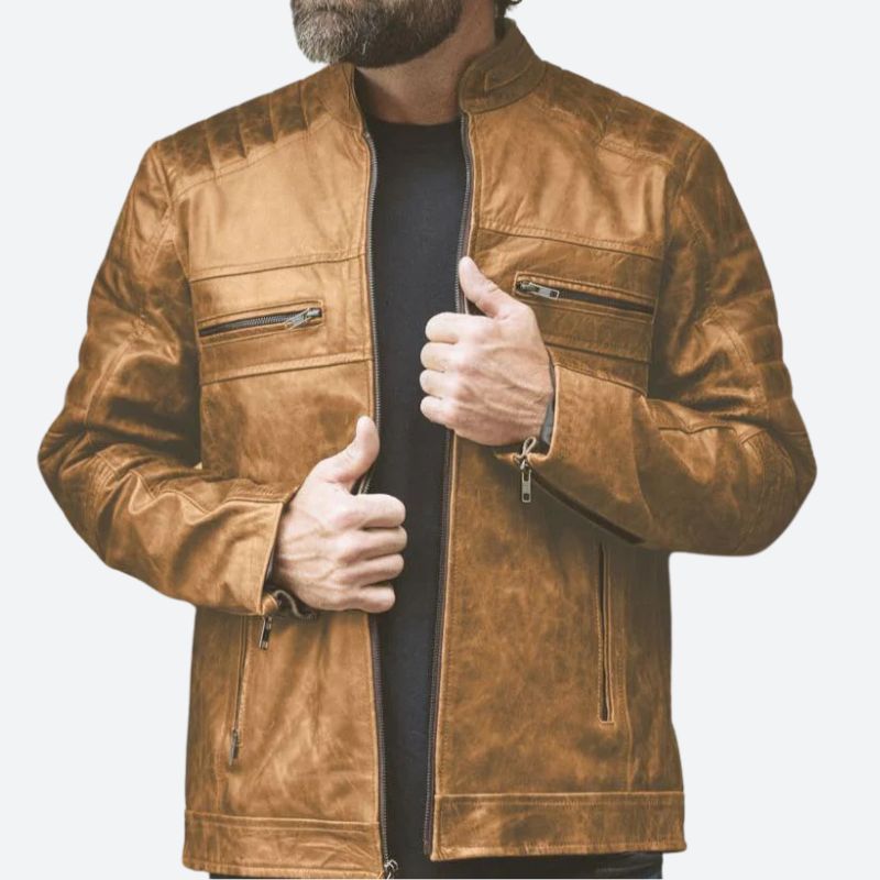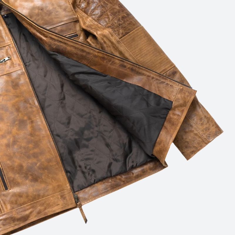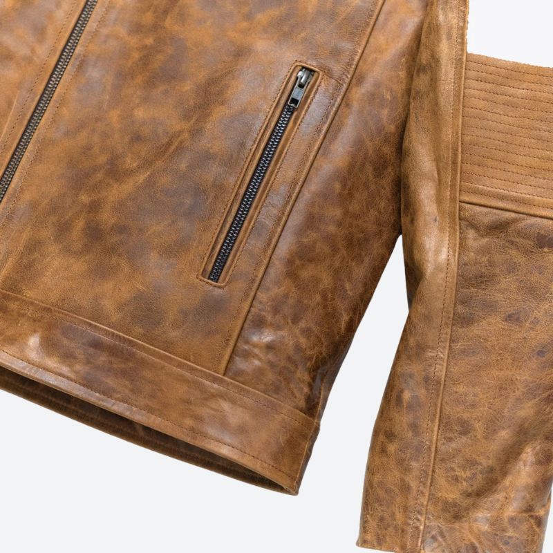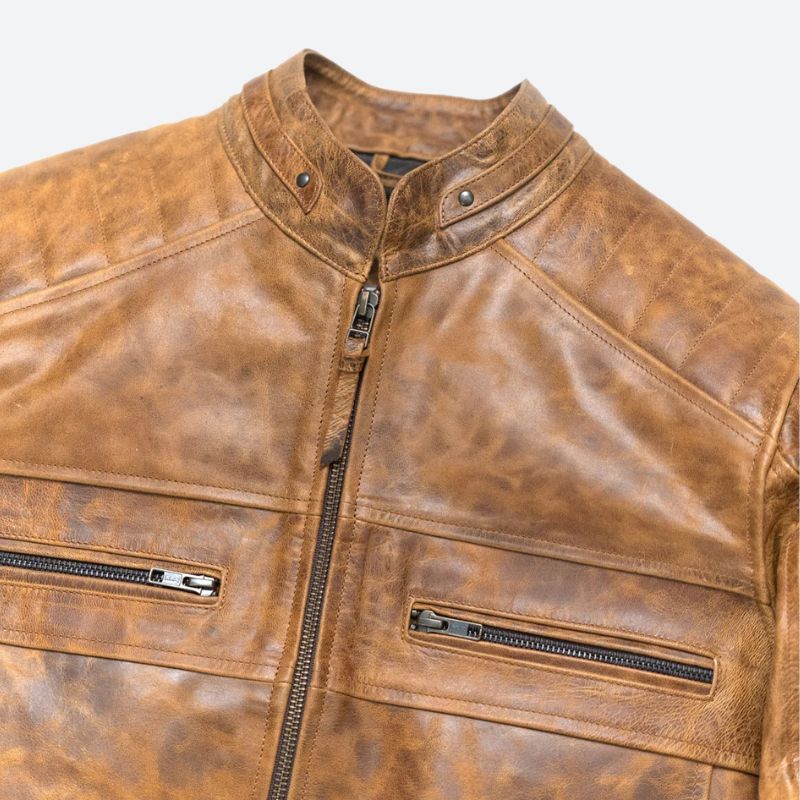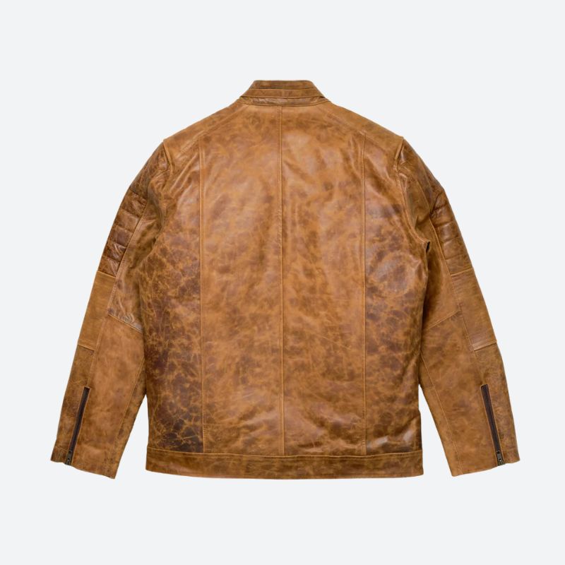 A rugged, road-ready classic, this Cafe Racer leather jacket is crafted from full-grain cowhide with a distressed finish for a timeless, lived-in look. With antique brass hardware and a snug fit, it’s made to handle the toughest rides and keep you comfortable on every journey.